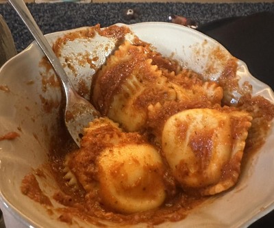 Absolutely delicious. The sauce isn’t so much of a marinara, which is nice, and a little kick. You get about 8 large raviolis.