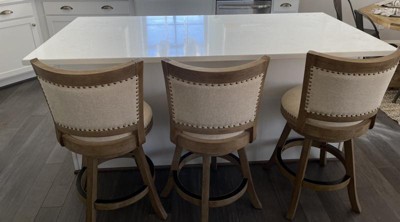Make a statement with the Melrose Counter Stool. Illuminated with a gorgeous multistep wire-brush finish, soft linen upholstery and genuine brass nail heads. Both sides of the backrest are upholstered and lined with antiqued finish nail heads. Available in a driftwood gray wood finish with a choice of oatmeal and ivory linen upholstery. Both options are designed with precision engineering, made with solid rubber wood and guaranteed to last. The Melrose also features a full-ring footrest protected with a metal kick plate on top, double seat apron, high density foam cushion and a ball bearing steel swivel plate which provides a flawless three hundred and sixty degree swivel. Available in 29 inch, bar height as well. Due to differences in monitors as well as variances in the finishing process, colors of products may appear different from those shown on the site.
