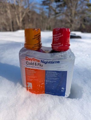 Compare to the active ingredients in Vicks® DayQuil® Cold & Flu and Vicks® NyQuil® Cold & Flu. When cold and flu season hits, you need to be prepared with powerful relief, day or night. Daytime & Nighttime Cold & Flu Relief is a powerful combination pack to help tackle cold and flu-like symptoms. Daytime in original flavor provides powerful non-drowsy relief of aches, fever, sore throat, nasal congestion and cough. Nighttime in cherry flavor relieves cold and flu-like symptoms such as aches, fever, sore throat, sneezing, runny nose and cough so you can rest. Gluten free. Daytime cold medicine is alcohol and antihistamine free.