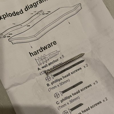 shelf is good quality, and for the size a good price. i got the shelf but it came with NO HARDWEAR. It had the bracket the hardwear attached to but no screws,anchors or anything. luckily i had some laying around i had bought from target months ago. ALSO no insctuctions. so i was so confused at first. but once i looked at other peoples photos and fiugred out where the screw owuld go, i was good. inconvient but not unmanageble. had i not had the matierials i would have been a lilttle more upset.