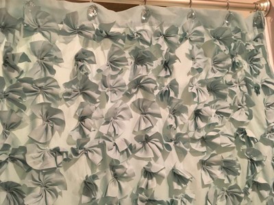 This is so pretty and feminine and makes my bathroom a happy room to go to. It is more green than blue but that is what I expected and wanted. The bows are mostly flat when you take it out and hand up but they should hang better with time or you could wash it and force them open while drying but I choose to wait as it is just lovely the way it is.