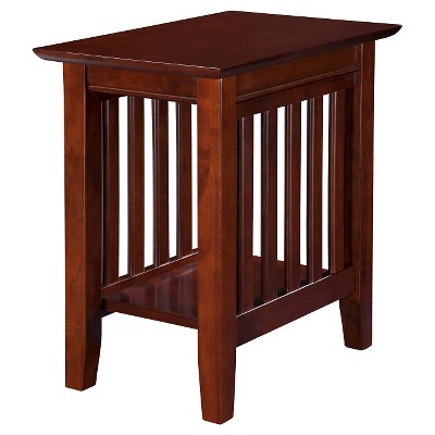 Classic and functional side table in a warm oak finish and mission style handle pulls offers abundant storage and utility. Faux front drawers act as a cabinet door with storage down the side. A pull-out shelf that can holds beverages, a phone, whatever you please and a magazine rack on the back make the table even handier paired with a chair, sofa or even a bed. Solid construction with pleasing oak veneer.
