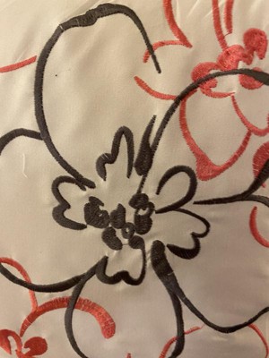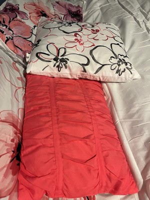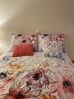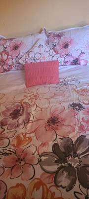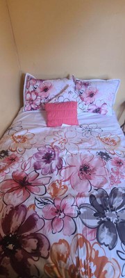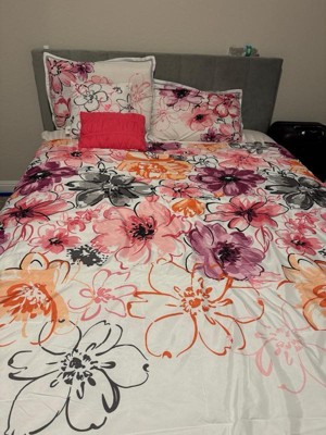 [This review was collected as part of a promotion.] Intelligent Design - Olivia Floral Comforter Set adds a burst of color to any room. The floral design has colors of orange, plum, pink, grey and black. The flip side of the comforter is a light grey. It comes with two pillowcases and two throw pillows. Olivia Floral Comforter Set is machine washable (cold) and use gentle cycle. Tumble dry on low and do not use bleach on comforter. I washed it a couple of times and it came out beautiful. Seams are intact and color is bright. Olivia Floral Comforter Set gives any room an uplift. Recommended