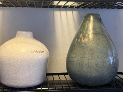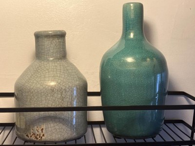 I attach a photo with a coffee can showing the scale of the vases. They all have craqueleur glazing. Eeach of the vases has scrapes on the glaze, I'm not sure if this is intentional distressing or not, but I am OK with it. For the price, I think they are a nice looking set for home decorating, nice colors. they have little rubber feet also.