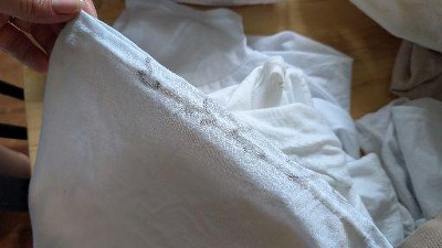Holes, stains and numbers with permanent marker written on the back of one of the T-shirts.