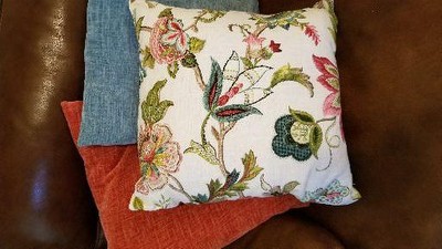 The pillows are nice and the pattern matches well with my drapes. However, the online picture makes it look like the background is an ecru or off white color. It's actually a bright white which may not hold up well with my two young boys in the house!