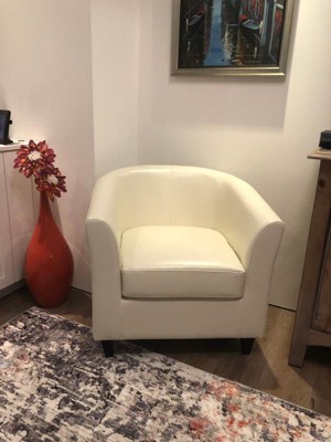 I had been looking for a small, white chair for our master bedroom. Many that I had seen were either too big for our space, too expensive or "not-a-fan-of-my-husband" faux leather. I was thrilled to find this real leather chair on the Target website. Right color. Real leather! GREAT price! It was delivered BEFORE they said it would come and very easy to put together. It's also VERY comfy! I'm a happy camper!