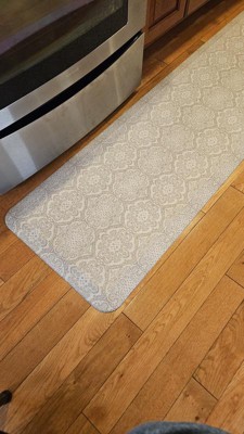Ordered 2 mats in Cantom, creamy cocoa. Mats are on a kitchen tile floor and are comfy to stand on. The problem is that creamy cocoa is lighter and not the warm cocoa tone in actual natural light than the online picture leads you to believe. The print is pleasing and echoes our backsplash tile. All in all, not bad, but not quite what I wanted. Will keep them as the cost and bother of returning them is not worth the effort.