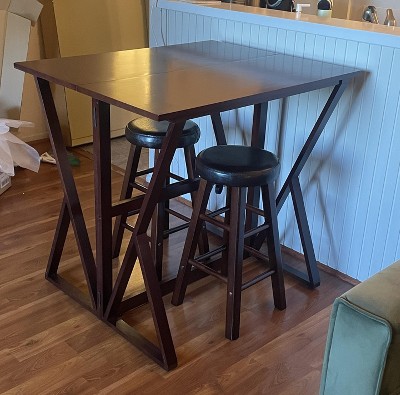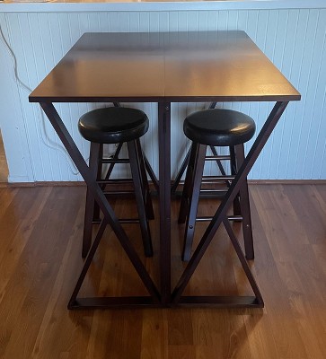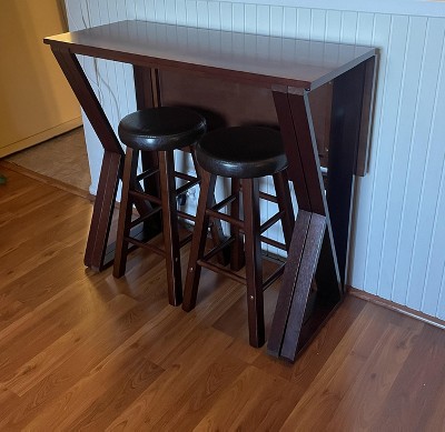 The Harrington 3pc Set Drop Leaf High Table with Counter Stools, Cushion Seat, 24" - Walnut & Black - Winsome is a wonderfully versatile dining table. This drop-leaf table sits higher, at bar table height, and has a paired-down frame with a minimalist feel and a beautiful walnut finish. Matching counter stools are included, complete with comfy cushion seats. The secondary table leaf hangs behind the table, or can be propped up to accommodate extra guests. This is a versatile dining table that's great for small spaces.