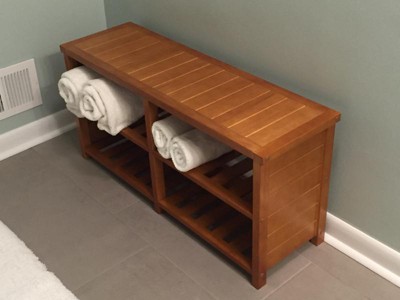 This bench is perfect in my bathroom; I’m using it to hold towels. While I appreciate the aesthetic of it, I do think it’s a little pricey. I was expecting more heft but I understand the type of wood is just more lightweight. My 10 yr old built it so it’s easy to assemble with a power drill. It feels structurally sturdy but I’m also a little afraid to sit on it because the wood is thinner than I expected. I will be keeping it because I’m too lazy to return it and it took me a while to find a bench I liked.
