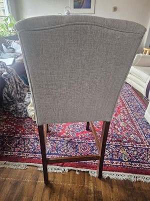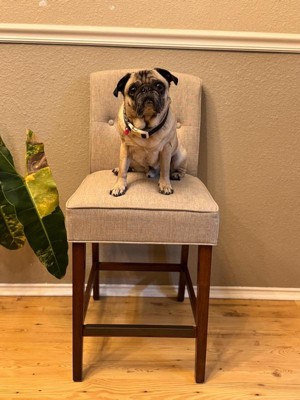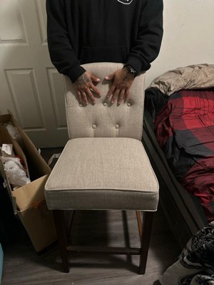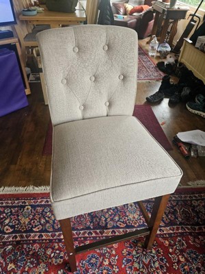 Update your dining room with the Khloe Tufted Counter Stool. This 26" stool is upholstered in a neutral tan color allowing it to fit into any dining decor. It features a subtle button tufted back and dark espresso wood leg finish to elevate its sophisticated look. The bronze metal kick plate provides extra feet support. Assembly required.