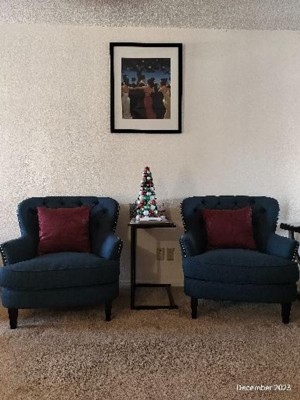The navy blue wing back chairs are a stylish addition to any room, offering a beautiful design and quality materials. While they are firm and may not provide plush comfort for long sitting sessions, many guests appreciate their elegant appearance and easy assembly. The chairs fit well in various spaces, making them ideal for accent seating. However, some guests noted issues with color accuracy and comfort, suggesting they are better suited for occasional use rather than daily lounging.
