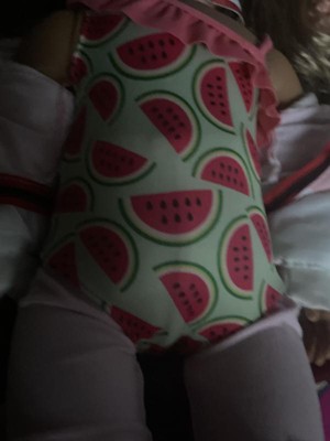 Shoes won't fit ag we put rubber band on. The suit fits ag if you use only shoulder strap armhole too tight. Everything else good. Very cute