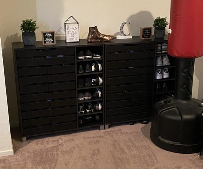 Purchased two one for my husband’s shoes and one for mine. However, his shoes do not fit in the larger shelves, the door won’t close all the way. He wears a size 12. So I basically scored two racks for my shoes and he gets the smaller shelves, that was the only downfall. Disregard the punching bag in the pic, still trying to figure out how to get rid of it.