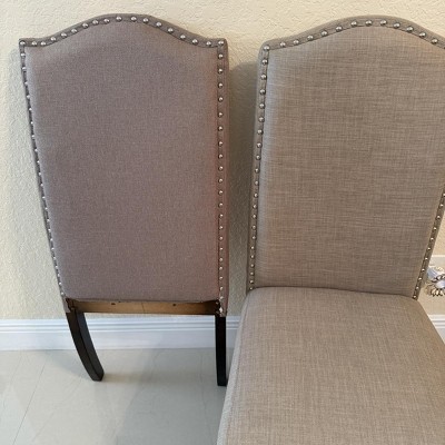 • A: The chairs are highlighted by gleaming nail head trim and a curvy camelback design.