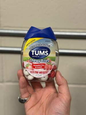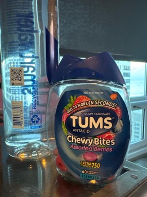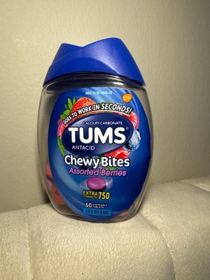 TUMS Chewy Bites Chewable Antacid Tablets go to work in seconds to make heartburn relief simple and delicious. When symptoms occur, take two to four chewable antacids, depending on the severity of your acid indigestion. Featuring the active ingredient calcium carbonate, these chewy antacid tablets relieve heartburn, sour stomach, acid indigestion and provide upset stomach relief associated with these symptoms. Each chewable antacid tablet delivers fast relief in every bite. With a delicious outer shell and soft center, these TUMS Chewy Bites come in three delicious assorted berry flavors. TUMS is the #1 recommended adult antacid brand by doctors, pharmacists and OBGYNs. As America's #1 antacid and trusted as a heartburn medicine for 90 years, TUMS is fully supported with a satisfaction guarantee. These calcium carbonate tablets are gluten free. These heartburn and acid indigestion relief tablets come in a compact, recyclable bottle that's easy to stow for whenever heartburn strikes. With TUMS Chewy Bites, you get a tasty way to fast heartburn relief in every chewy bite. *#1 Doctor recommended claim based on IQVIA survey, 2024 1. Consult with HCP on appropriate management of your GLP-1 side effects. Please consult with your HCP before taking this product and use as directed on label. Haleon does not sell, endorse, or promote use of any particular GLP-1 medication.