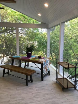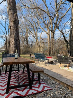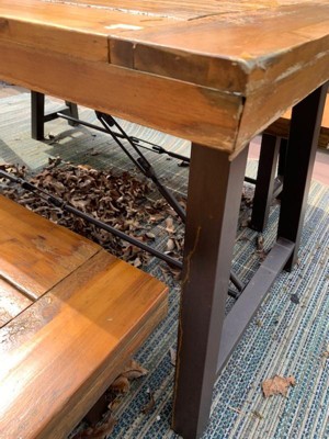 We ordered this table with benches, looked perfect for our outdoor patio area. The metal frame is great! However, the wood on the top of the table and benches has already warped, is coming apart in areas, cracking in other areas and the finish is coming off. We only had it through this summer, got it in May, and it doesn't look like it will make it another season. Unfortunately unable to return it since it is past the return/refund time period. I would not recommend this due to the wood only lasting 3 months.