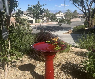 I was looking for a more substantial bird bath other than the ones with a glass bowl and a stand. The red color adds a pop of color to the garden. And the design with the birds is very pretty. I posted a picture of my birdbath in Facebook and received positive comments.