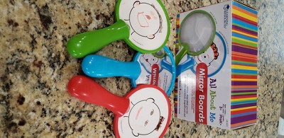 [This review was collected as part of a promotion.] My 7 year old and 2 year old loved these mirrors (and honestly, I did too). Each mirror gives you a closer look. On the back, you are able to use a dry erase marker and draw in the face template! Even their Dad was enjoying himself playing around with them. And as an unexpected bonus, I can go get them and use them when I want to put on a bit of makeup.