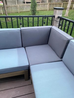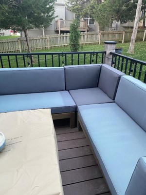 We bought this couch and not even a month after, the cushions started changing colors differently so they don't match. Some are darker blue, some are lighter. Also, when it rains, they hold water so you can't sit on them for a long time after defeating the whole purpose our having outdoor furniture. Save yourself the trouble and don't buy this low-quality outdoor sectional.