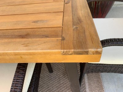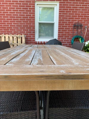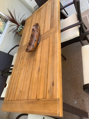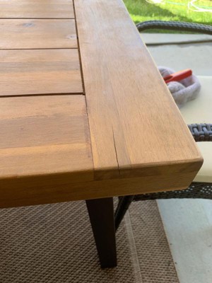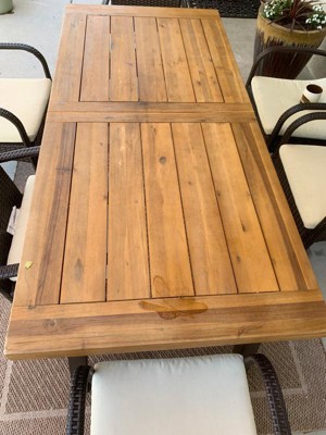 The table is beautiful and very well made. We have had every meal outside since it arrived. The only drawback is that the chairs on the ends don’t fit under the table. I wish they had made it 2 inches wider so all chairs could push under. We have only had it a week, but we love it.