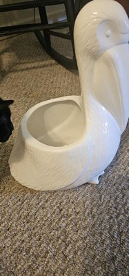 This graceful white ceramic pelican planter adds fun and personality to any home or garden. This planter is designed to look like a cute and quirky pelican design with a round back. The back opening is ideal for displaying a plant, flower, or succulent in any indoor or outdoor setting. The planter is made of durable dolomite ceramic that is smooth and durable, ensuring that it can last for a long time. The planter is white that gives it a clean and elegant look. The planter also has a realistic and detailed design that captures the charm and character of the pelican. Whether it is placed on a porch, patio, balcony, or windowsill, this pelican planter adds a touch of coastal charm and whimsy to any space. It also makes a great gift for any animal lover or gardener. This planter measures 9.5 inches long, 6.5 inches wide, and 13.5 inches high. This white ceramic pelican planter is a cute and quirky way to display and grow plants in style.