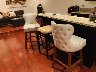 These chairs are gorgeous! They look expensive but were such a great deal! They check off all the boxes: neutral color, tufting, nail head trim, swivel, and great price. They are very sturdy and well-made too. The only downside is that it only comes in sets of 2. We live in Chicago, and the manufacturer is in the suburbs, so we were able to go to their outlet to pick up a single stool to go along with the pair from Target. I'm so happy with the purchase and would definitely recommend them to anyone looking for a good, affordable stool.