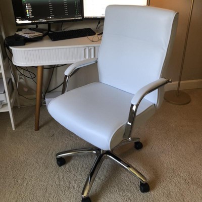 This chair is beautiful. I love the white color and the chrome adds a beautiful touch. The shape of the chair supports my lumbar very well and is overall a comfy chair! I say this is a pretty satisfying purchase, I love it