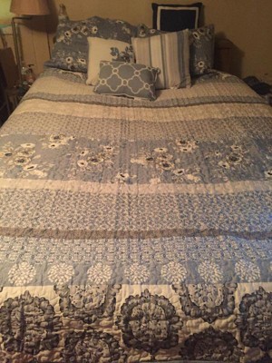 [This review was collected as part of a promotion.] I got this because I liked the pattern and color. It is primarily a dusky sort of blue which is perfect for the bedroom I want it for. The set includes 2 king shams of the same pattern and 3 throw pillows. This is a good summer weight as it is very lightweight and thin.the fabric is soft and the overall quilting pattern holds the fill in well. It is patterned on one side and solid color on the back. The color coordinated edge binding is attached well. I have machine washed and dried the coverlet and shams twice and they have held up well without fading, shrinking, buckling, pilling or anything else weird, It is a good addition to a country boho look bedroom. The throw pillows? Meh. The filling was shifted and had lumped, bunched up out of the bag. But they coordinate and are cute. It is a good value, is cute and is well made.