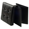Whether you're relaxing with your feet up or using the Ashford Ottoman as extra seating, this unique piece will also provide plenty of storage. Perfect for keeping extra cushions in the living room, games and toys in the family room, or shoes and clothing in the bedroom. The cushioned faux leather seat lifts away, affording easy access to the storage space inside. The base of the ottoman easily folds so when it is not in use, the unit can be moved or compactly stored. Both top and base are made of black faux leather. Overall size is 15"H x 15"W x 15"D.