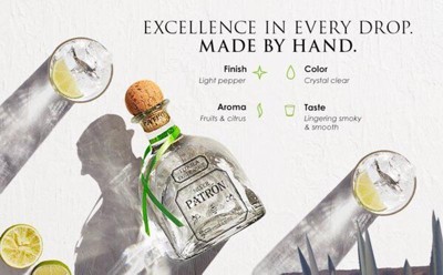 mexico products description: roca patron silver tequila is a handmade tequila, made in halisco, mexico, which offers an exquisite and complex taste profile. made of the best 100 % blue agawa weber and carefully processed inside and outside, this tequila roca patron silver provides a sweet taste of agave, which is perfectly balanced with notes of black pepper, pumpkin and lime tea for a drink, which is just as remarkable in quality as in status. when you want to demonstrate your style, mix this patron tequila with several pleasant alcoholic beverages, such as the margarita or haibol cocktail. with alcohol content 45 % in volume the crystal pure color of this perfect tequila in combination with its unique taste helps to create an unforgettable taste. patron attention to detail provides just perfect tequila. please drink responsibly