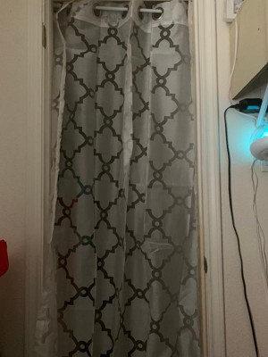 [This review was collected as part of a promotion.] I like this panel. It is a silver sheer that I put in my bathroom. The holes on the top are big for a nice fancy bar to put on. I like the pattern that it is nice circles an nice shiny sheer.