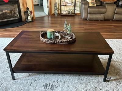 Love this coffee table!! I was a little unsure about how the wood would actually look, but as soon as we took it out of the box I saw it was exactly what I was looking for...good quality wood, dark with a slightly weathered look. Solid metal frame, and fairly easy to assemble. Looks absolutely beautiful in my family room! Highly recommend it!