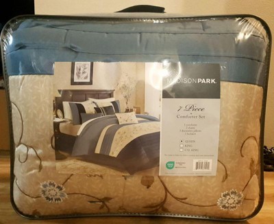 [This review was collected as part of a promotion.] I really like this Monroe 7 piece comforter set in navy blue. I have a queen size bed and it fit perfectly. The comforter is soft and the design is pretty. I do wish it came with sheets though. It would be a 5 if it came with sheets.