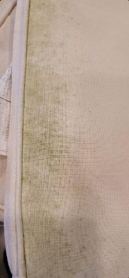 Hello, Thank you for taking the time to leave feedback. We are very sorry to hear of your cushions. The covers are of a water resistant polyester. It should not require more than just a mild soap as any stains should be surface level and be able to be wiped away. Please contact customer service for more care and maintenance information and so that we can remedy this situation with replacements if neccessary. -Customer Service Agent