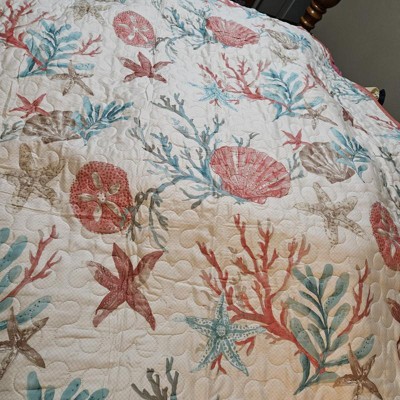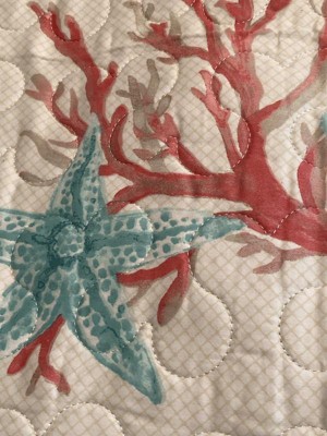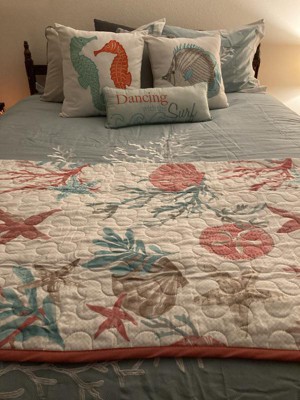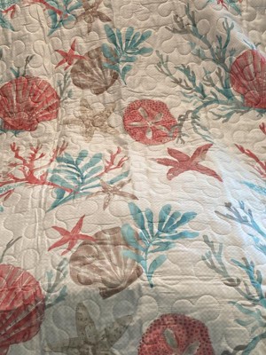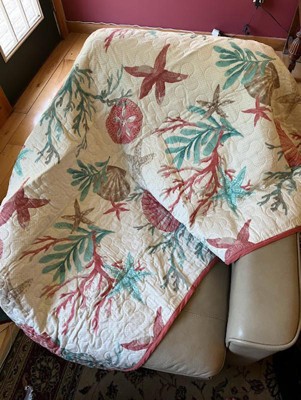 [This review was collected as part of a promotion.] This oversized throw is so nice. Its roomy 50X70 inch and is a nice addition to any room. The throw is made of cotton, which I love It can be machined washed cold and dry low so its durable. The quilt is made very well and sewn nicely even down to the corners. The quilt adds lots of color and is reversible to an aqua color. The coral, starfish, seashells and sea plants look welcoming, especially on a cool summer night, just to cozy up in. The quilted throw is so soft and supple without being too heavy while adding warmth. I like this throw for the colors, warmth, the quality and I love the cotton. I highly recommend this quilt and plan on using this for a very long time.