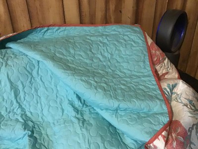 [This review was collected as part of a promotion.] Pebble Beach Oversized Cotton Quilted Throw is a gorgeous Quilt. It is the perfect thickness for a throw! It is 50x70 with bright coral and aqua coastal print on it. It's very well crafted and very nicely stitched. My living room is a beach theme and it adds to the warmth and feeling you have sitting on the beach! Highly recommend this beautiful lightweight quilt!