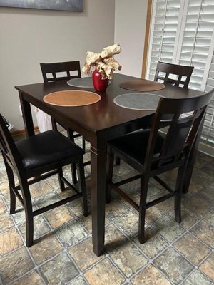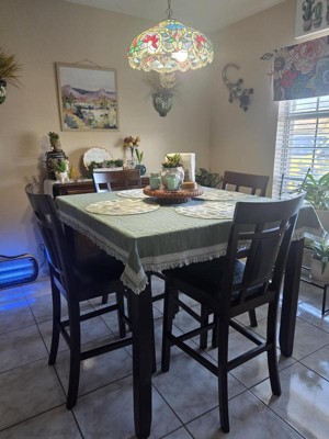 I’m actually really happy with this dining room set. It looks more modern and chic compared with my old rectangular dining room table. I was a little worried about the counter height chairs but it’s actually a perfect height and I’m 5’3”. It’s not too high. I really could not be happier with my purchase!