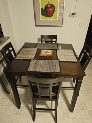 Table and chairs look absolutely perfect in my kitchen. I love the deep color and the perfect height of the chairs …so happy with it