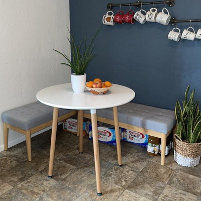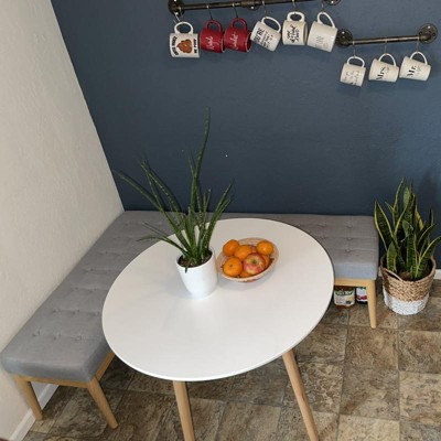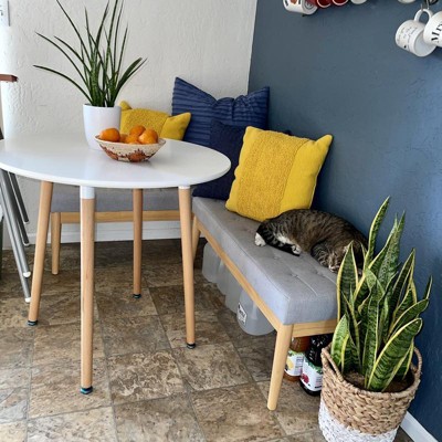 These benches are perfect and high quality, especially for the price point! I spent a lot of time looking for two that fit my look I wanted and didn’t totally break the bank.. well these are it! I wanted to be able to butt them together in the corner to make a little L shaped seating area and these work perfectly! Great quality, very sturdy and the perfect size for our very small breakfast nook in our extra small kitchen! These took me less then 5 minutes to put together! We just had twins and wanted an area to sit and eat with them while they’re in their high chairs, but had very limited room. Paired with the perfect small table that was decently priced and great quality from Target, Target pillows as well = PERFECTION!! So in love with our small breakfast nook, all thanks to Target!