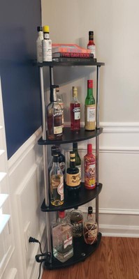 I use this for my home bar. Got it on sale for about 40 bucks. It fits in corners perfectly & was really simple to assemble. I was initially worried about the weight it would hold, but it's been up for about a month and doesn't show any signs of buckling or instability. I recommend anchoring it to the wall so it won't tip.