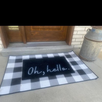 This rug is the perfect size to put a doormat on top of. I have gotten dirt on it and it's come off easily with the sweep and I could also see that I would be able to scrub it and put a hose on it with no issue. It is truly black and white and looks very nice on my porch