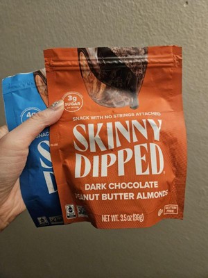 [This review was collected as part of a promotion.] I'm a big fan of the skinny dipped brand for flavored almonds. I think that these are the perfect sweet snack that is not too sweet so it is really appealing for adult taste buds. I love that it is a healthier alternative to traditional chocolate covered almonds. Tbh I prefer the regular original dark chocolate almonds but the peanut butter chocolate is great for peanut butter fans! The coating is slightly thicker than the regular dark chocolate almonds