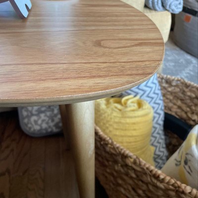 I like the design and shape of this table. We were looking for something smaller and more low-profile. The color, however, is way off. It’s listed as “natural” but it is more of an orangey-yellow golden oak color. In the picture I attached, the picture frames above the table are natural. You can see the vast difference. Also, the stickers will not come off.