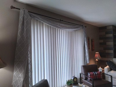 Gray window scarf over large living room window. Frames out very nicely.