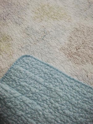 The colors and design of the trees is really pretty but I didn’t realize the reverse side was light blue with white polka dots. It makes the quilt look a little young. I wish it was all a solid color and a darker shade of blue. I also rated this lower due to the size. The quilt looks very generous in size in the photo but the King size I bought doesn’t really “fit” our king bed. It doesn’t even hang down enough on the sides to reach the top of my bed skirt. Very disappointed in that. The quilt is lightweight and thin so it is nice for the summer months. Overall this just isn’t what I was hoping for.
