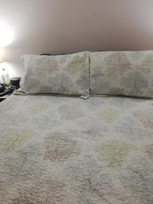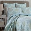 Delicate seaweed branches floating on a watery background bring the beauty of an underwater garden to your bedroom in the Saltwater quilt set. Turquoise blue, green and brown accents on a crisp white ground with subtle aqua stripes are cool and serene for a tranquil night sleep. The quilt reverses to a crisp white dot on bright turquoise. Prewashed for softness, this 100% cotton quilt set becomes cozier with each wash. Filled with a blend of 80% cotton/20% poly it is light weight yet can be layered for year-round use. Set includes one quilt and two shams for full/queen and king size, one sham for twin size. Machine washable for easy care.