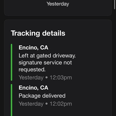 I didn’t receive my package because it was not left at my front door liked I asked instead left outside the gate where we all park!!