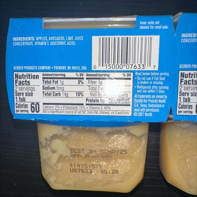 I bought this about a month ago and gave it to my 8 month old daughter. She loved it! She’s a big fan of Apple and I wanted to introduce her to avocado. That’s why I gave this a try. I just wish that there was maybe a little more of the avocado in this mix, mostly the taste is Apple. Sometimes it’s tough to tell the difference between this and the regular Apple tub without the cardboard packaging around it.