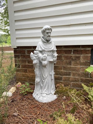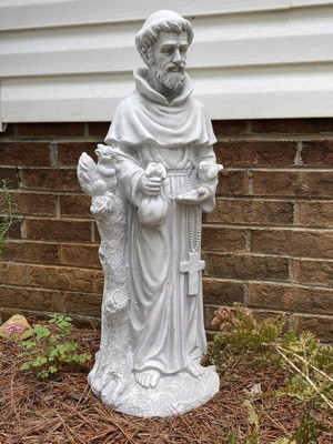 [This review was collected as part of a promotion.] I absolutely love this statue of Saint Francis! It is excellent quality, great detail, durable and wonderful size. The statue stands 31" tall and 12" wide. Saint Francis is holding a bird, cross and has a squirrel near his arm holding a satchel. The detail on the statue is intricate and beautiful. Looks lovely in my garden. He weighs about 13 lbs and is sturdy. I would recommend this statue to anyone looking for one because it is so charming!